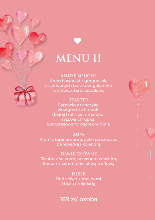 krem z białych szparagów z oliwą truflową, pierś kaczki z puree z selera i gruszki w sosie na czerwonym winie, carpaccio z tuńczyka z nutą białej trufli i marakui, risotto z selerem, kurkami i serem brie czy desery, które idealnie dopełnią romantyczny wieczór.